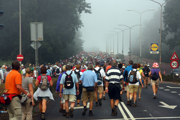 2. zo’n 40.000 wandelaars. en de nodige toeschouwers en bezoekers van de zomerfeesten die een week duren. er hebben ongeveer 1,4 miljoen mensen de stad bezocht afgelopen week :-)
